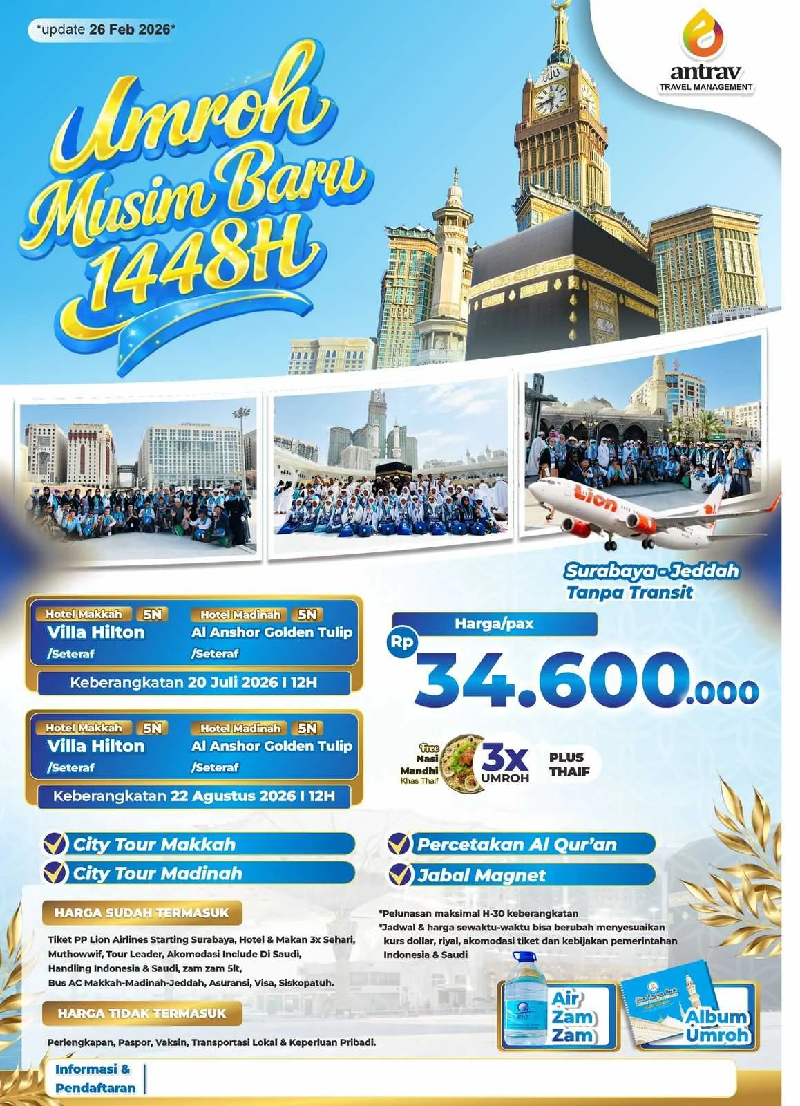 Gebyar Promo Awal Musim 🎉 BismillahirrohmanirrohimUmroh Musim Baru 1448H ✨🌈 Antrav Mustika Musafir 💙🩵🗓️Keberangkatan : 🛫 Via Lion Air (Surabaya-Jeddah) Tanpa Transit 🔥 GRATISSSS 🔥🕋 Free 3X Umroh🏜️ Free City Tour Mekkah & Madinah🏛️Free Jabal Magnet & Percetakan Al Quran🎢 Free Thaif & Nasi Mandhe📘 Free Album Kenangan🖼️ Free Piagam Umroh 🍶 Air Zamzam 5Lt […]