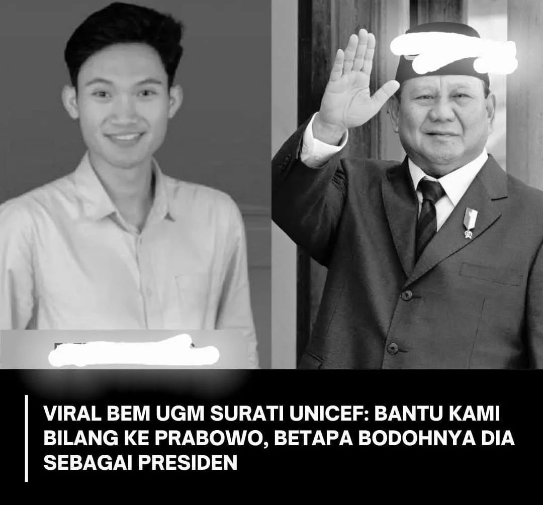 Ketu BEM UGM juga menilai Prabowo buta pada realitas dan tidak mau belajar. Dengan tegas, melalui surat itu, Tiyo menyampaikan pesan kepada UNICEF, “Help us to tell Prabowo how stupid he is as a president (Bantu kami beri tahu Prabowo Subianto betapa bodohnya dia sebagai presiden)